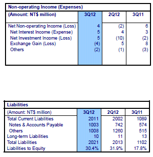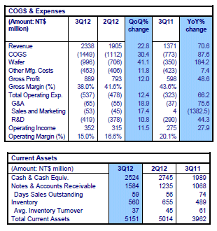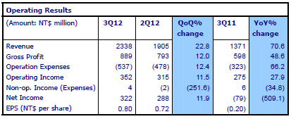 Hsinchu, Taiwan –October,26 2012 – Faraday Technology Corporation (TSE: 3035), a leading fabless ASIC service and silicon IP provider, today announced its unconsolidated operating results for the quarter ended September 30, 2012. The third quarter revenue was NT$2,338 million, while net income and basic earnings per share came to NT$322 million and NT$0.80, respectively.