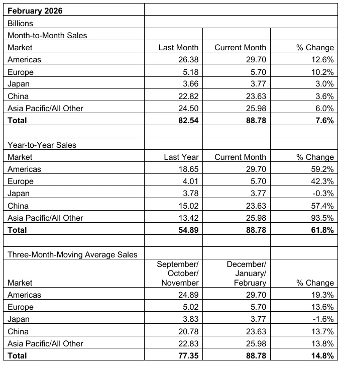 Regionally, year-to-year sales in February were up in Asia Pacific/All Other (93.5%), the Americas (59.2%), China (57.4%), and Europe (42.3%), but declined in Japan (-0.3%). Month-to-month sales in January increased in the Americas (12.6%), Europe (10.2%), Asia Pacific/All Other (6.0%), China (3.6%), and Japan (3.0%).