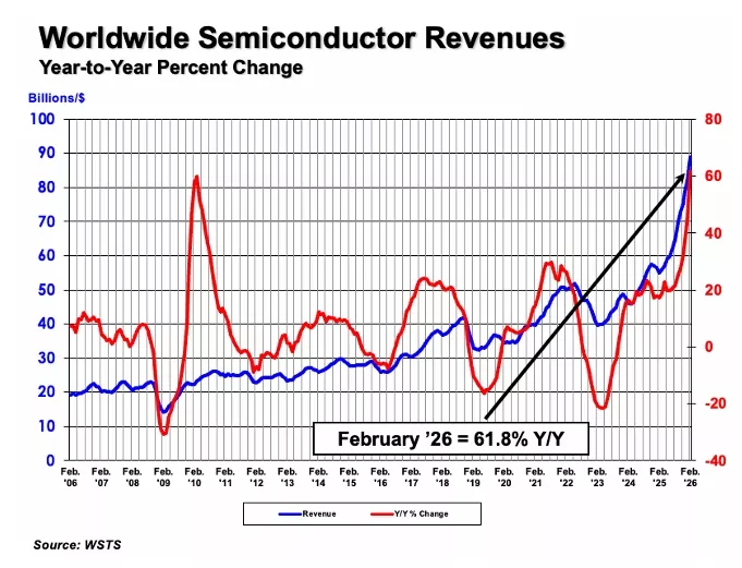 WASHINGTON — April 3, 2026 — The Semiconductor Industry Association (SIA) today announced global semiconductor sales were $88.8 billion during the month of February 2026, an increase of 7.6% compared to the January 2026 total of $82.5 billion and 61.8% more than the February 2025 total of $54.9 billion. Monthly sales are compiled by the World Semiconductor Trade Statistics (WSTS) organization and represent a three-month moving average. SIA represents 99% of the U.S. semiconductor industry by revenue and nearly two-thirds of non-U.S. chip firms.