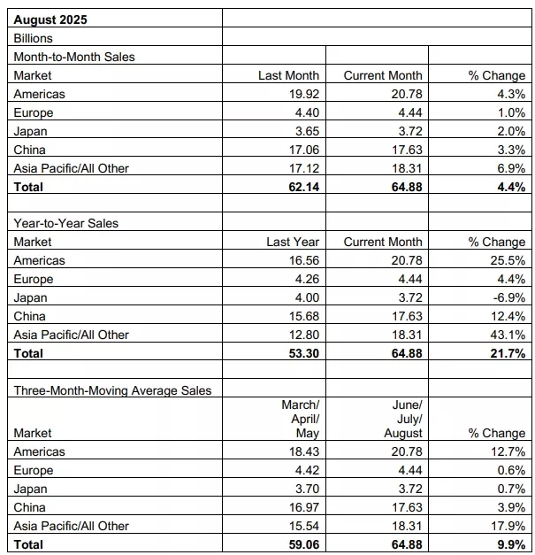 Regionally, year-to-year in August sales were up in the Asia Pacific/All Other (43.1%), Americas (25.5%), China (12.4%), and Europe (4.4%), but decreased in Japan (-6.9%). Month-to-month sales in August increased in the Asia Pacific/All Other (6.9%), Americas (4.3%), China (3.3%), Japan (2.0%), and Europe (1.0%).