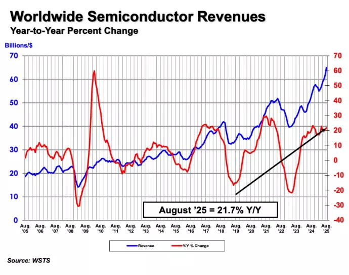 WASHINGTON — October 3, 2025 —The Semiconductor Industry Association (SIA) today announced global semiconductor sales were $64.9 billion during the month of August 2025, an increase of 21.7% compared to the August 2024 total of $53.3 billion and 4.4% more than the July 2025 total of $62.1 billion. Monthly sales are compiled by the World Semiconductor Trade Statistics (WSTS) organization and represent a three-month moving average. SIA represents 99% of the U.S. semiconductor industry by revenue and nearly two-thirds of non-U.S. chip firms.