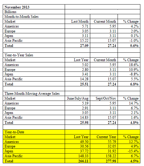 Regionally, sequential monthly sales increased in the Americas (4.2 percent), Europe (2.0 percent), and Japan (0.1 percent), but fell slightly in Asia Pacific (-1.0 percent). Compared to November 2012, sales increased in the Americas (18.6 percent), Europe (10.9 percent), and Asia Pacific (5.5 percent). Sales in Japan decreased (-8.8 percent) compared to November 2012, in part due to the devaluation of the Japanese yen, but the region has been closer to last year’s pace in recent months.