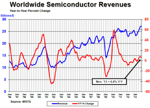 WASHINGTON—Jan. 6, 2014—The Semiconductor Industry Association (SIA), representing U.S. leadership in semiconductor manufacturing and design, today announced that worldwide sales of semiconductors reached $27.24 billion for the month of November 2013, an increase of 6.8 percent over November 2012 when sales were $25.51 billion and an uptick of 0.6 percent over the previous month’s total. The global industry notched its ninth consecutive month of increasing sales in November, led largely by the Americas, which grew by 18.6 percent year-over-year and 4.2 percent month-over-month. All monthly sales numbers are compiled by the World Semiconductor Trade Statistics (WSTS) organization and represent a three-month moving average.