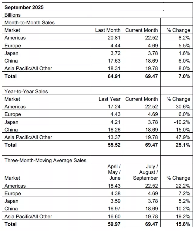 Regionally, year-to-year sales in September were up in the Asia Pacific/All Other (47.9%), Americas (30.6%), China (15.0%), and Europe (6.0%), but decreased in Japan (-10.2%). Month-to-month sales in August increased in the Americas (8.2%), Asia Pacific/All Other (8.0%), China (6.0%), Europe (5.5%), and Japan (1.6%).