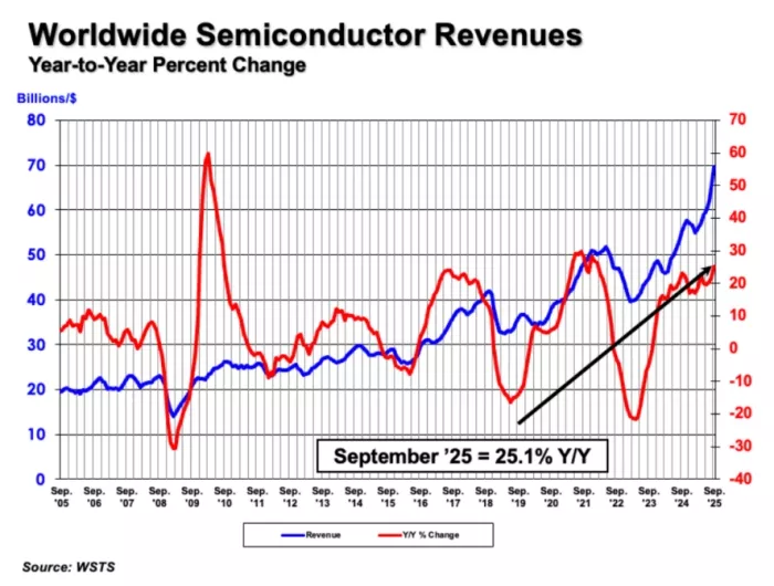 WASHINGTON—November 4, 2025—The Semiconductor Industry Association (SIA) today announced global semiconductor sales were $208.4 billion during the third quarter of 2025, an increase of 15.8% compared to Q2. Global sales were $69.5 billion during the month of September 2025, an increase of 25.1% compared to the September 2024 total of $55.5 billion and 7.0% more than sales in August 2025. Monthly sales are compiled by the World Semiconductor Trade Statistics (WSTS) organization and represent a three-month moving average. SIA represents 99% of the U.S. semiconductor industry by revenue and nearly two-thirds of non-U.S. chip firms.
