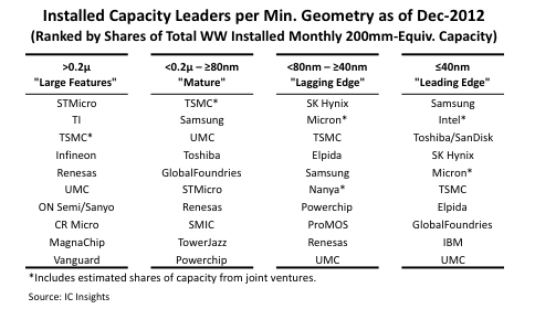 Figure 2 shows the leading suppliers of installed wafer capacity based on minimum geometry. It is not surprising that Samsung, Intel, Toshiba/SanDisk, SK Hynix, and Micron top the list with the greatest amount of leading-edge capacity. The biggest capacity holders in the large-feature process category (>0.2µ) consist of several analog and mixed-signal chip suppliers.