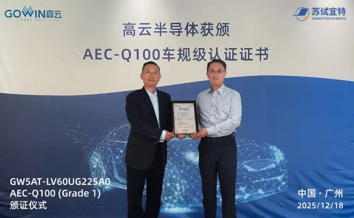 January 5, 2026 -- GOWIN Semiconductor has expanded its automotive-grade FPGA portfolio with another major milestone. The company’s 22nm FPGA device, GW5AT-LV60UG225A0, has successfully passed AEC-Q100 Grade 1 certification, the internationally recognized reliability standard for automotive electronics.