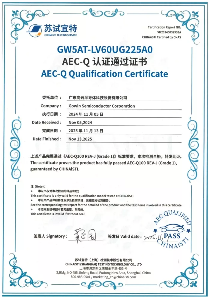 To date, GOWIN Semiconductor has achieved AEC-Q100 certification for nearly 10 automotive-grade FPGA products, with additional devices currently undergoing certification. This progress demonstrates the company’s long-term commitment to the automotive market and highlights its strong R&D capabilities and robust quality management system for high-reliability products.