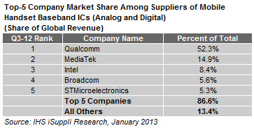 For the overall market for baseband chips governing all kinds of cellphones, Intel ranks third, behind Qualcomm and MediaTek of Taiwan, as presented in the table below. Intel held an 8.4 percent share of global revenue for cellphone basebands in the third quarter of 2012, the most recent period for which figures are available. However, Intel’s portion of the market represented only a sliver of the 52.0 percent share held by market leader Qualcomm.