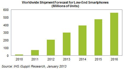 Shipments of low-end smartphones will rise at a compound annual growth rate (CAGR) of 51 percent from 2011 to 2016. In contrast, high-end smart shipments will grow at a CAGR of only 12 percent during the same period.