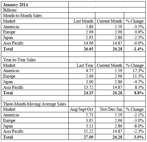 WASHINGTON—March 3, 2014—The Semiconductor Industry Association (SIA), representing U.S. leadership in semiconductor manufacturing and design, today announced that worldwide sales of semiconductors reached $26.28 billion for the month of January 2014, an increase of 8.8 percent from January 2013 when sales were $24.15 billion, marking the industry’s highest-ever January sales total and the largest year-to-year increase in nearly three years. Global sales from January 2014 were 1.4 percent lower than the December 2013 total of $26.65 billion, reflecting normal seasonal trends. Regionally, sales in the Americas increased by 17.3 percent compared to last January. All monthly sales numbers are compiled by the World Semiconductor Trade Statistics (WSTS) organization and represent a three-month moving average.