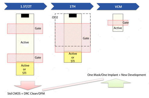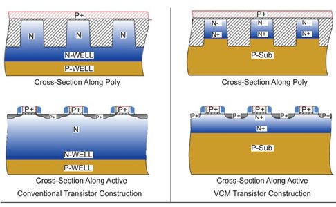 The small size of the VCM bit cell is enabled by a new transistor construction in silicon. Building a conventional transistor requires a P+ gate atop an N-well, which is deeper than the shallow trench isolation (STI) that isolates adjacent transistors (see Figure 2). Building an anti-fuse transistor using this conventional technique requires a large bit cell to accommodate the deep N-well beneath the gate and its associated spacing rules. The new VCM bit cell incorporates an N-well that is shallower than the STI and uses the P substrate to provide the insulation between adjacent bit-cell transistors. (For more on the VCM technology, click here. For a video of Kilopass CTO Harry Luan describing the VCM technology, click here.)