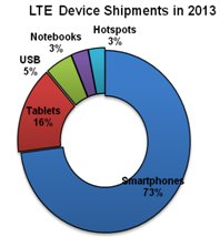 Smartphones represented 73% of the LTE cellphone market in 2013 while LTE tablets reached 16%. "We expect tablets and hybrid notebooks to drive standalone LTE modem penetration rates in 2014 while integrated com-processors continue to lead in revenues." said Carter L. Horney, the author of the report. He went on to say, "The total LTE baseband market grew from 103 million units in 2012 to 219 million in 2013. We forecast that it will grow by 47% to 338 million units this year."