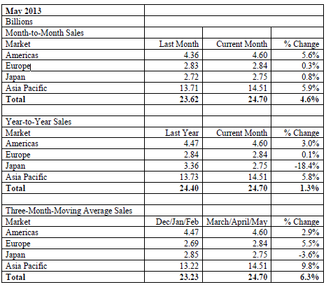 Regionally, sales in May increased compared to April in Asia Pacific (5.9 percent), the Americas (5.6 percent), Japan (0.8 percent), and Europe (0.3 percent), marking the first time since September 2012 that all four regions have seen sequential monthly growth. Compared to the same month in 2012, sales in May increased in Asia Pacific (5.8 percent), the Americas (3.0 percent), and Europe (0.1 percent), but fell steeply in Japan (-18.4 percent), largely because of the devaluation of the Japanese yen.