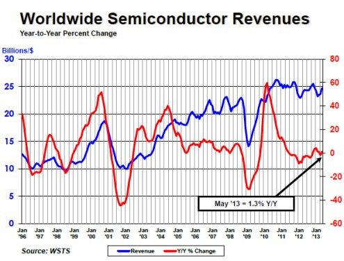WASHINGTON, D.C. -- July 1, 2013 -- The Semiconductor Industry Association (SIA), representing U.S. leadership in semiconductor manufacturing and design, today announced that worldwide sales of semiconductors reached $24.70 billion for the month of May 2013, an increase of 4.6 percent from the previous month when sales were $23.62 billion. This represents the largest sequential monthly increase in sales for the industry since March 2010. Global sales in May 2013 were 1.3 percent higher than the May 2012 total of $24.40 billion, and year-to-date sales in 2013 are 1.5 percent higher than they were at the same point in 2012. All monthly sales numbers are compiled by the World Semiconductor Trade Statistics (WSTS) organization and represent a three-month moving average.