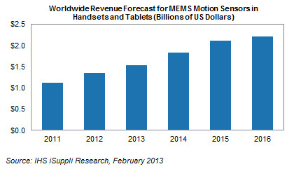Revenue this year for MEMS motion sensors used in cellphones and tablets will amount to $1.5 billion, up 13 percent from $1.3 billion in 2012, according to the an IHS iSuppli MEMS Special Report from information and analytics provider IHS (NYSE: IHS). While this will be down from the robust 21 percent increase in 2012 and the phenomenal 85 percent boom in 2011, it still represents a strong rise compared to the tepid growth expected for most electronic components during 2013.