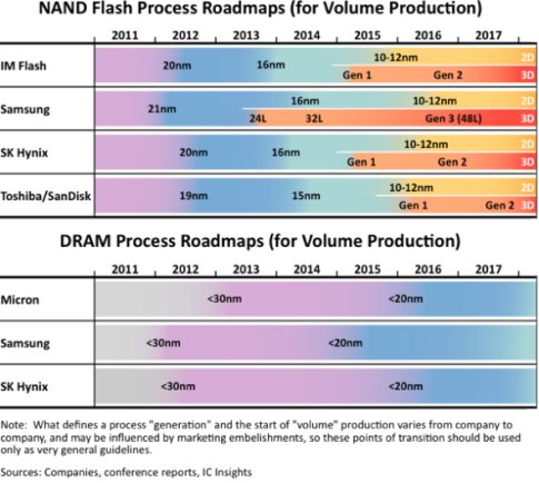 In mid-2014, the most advanced process technology used to make NAND flash devices was based on 20nm and smaller feature sizes, and just under 30nm for DRAMs. The process technology roadmaps shown in Figure 1 suggest that by 2017, the minimum feature size for 2D (planar) NAND flash will migrate to 10-12nm and to ≤20nm for DRAM. The transition points shown in the chart should be used only as rough guidelines since reported minimum feature sizes and mass production definitions are very imprecise and may be influenced by marketing “numbers games” as companies strive to get ahead of the competition.