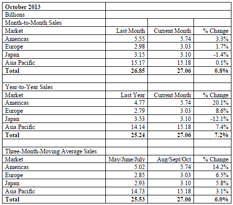 Regionally, sequential monthly sales increased in the Americas (3.3 percent), Europe (1.7 percent), and Asia Pacific (0.1 percent), but decreased in Japan (-1.4 percent). Compared to October 2012, sales increased in the Americas (20.1 percent), Europe (8.6 percent), and Asia Pacific (7.4 percent), but fell in Japan (-12.1 percent), in part due to the devaluation of the Japanese yen.