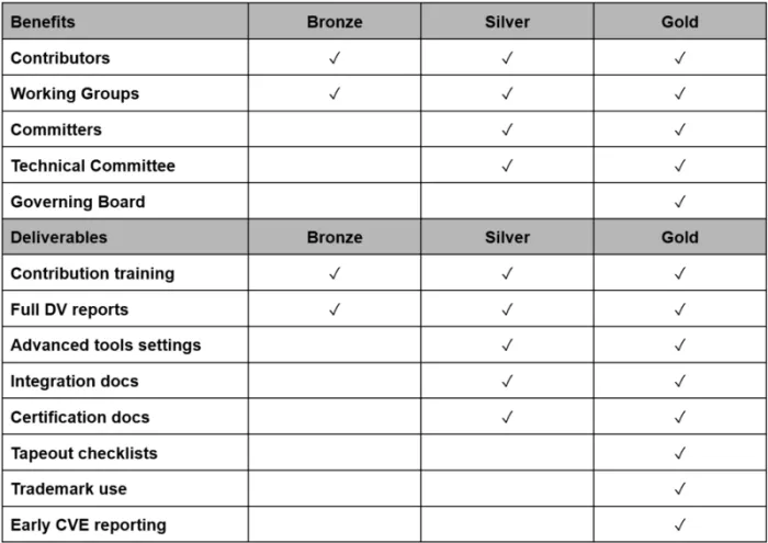 We believe that a membership model is fundamentally right for an open-source silicon hardware project, since it provides protection against IP pollution, it provides a Governing Board of committed partners steering the project, and it delivers a stable source of funds to maintain the critical engineering infrastructure for the project: servers, continuous integration systems, boards and tools.