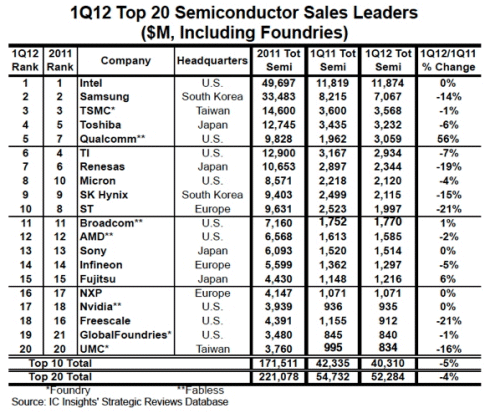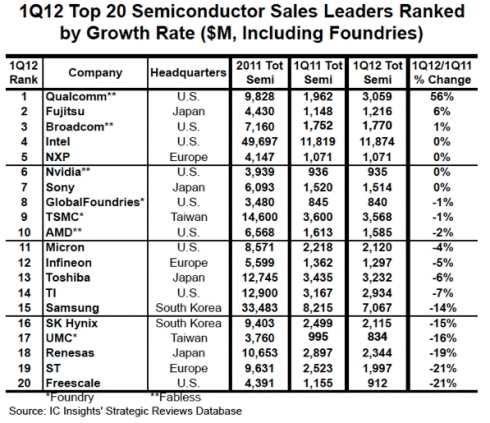 Qualcomm, Micron, and GlobalFoundries Gain in 1Q12 Top 20 Ranking