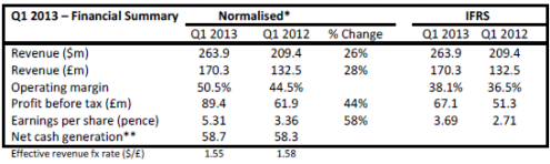Normalised operating margin was 50.5% in Q1 2013, compared to 46.6%in Q4 2012 and 44.5% in Q1 2012.
