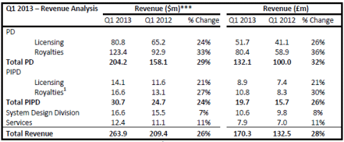 Royalties are recognised one quarter in arrears with royalties in Q1 2013 generated from semiconductor unit shipments in Q4 2012. PIPD royalties in Q1 2013 were $16.6million, up 27% year-on-year. There were no catch-up royalties in Q1 2013. Excluding catch-up royalties of $2.1m in Q1 2012, underlying PIPD royalties were up 50% year-on-year. This compares with foundry revenues that increased by about 20% over the relevant shipment period (i.e. Q4 2012 compared to Q4 2011).