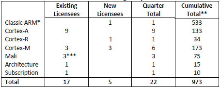During the quarter ARM also signed another ARMv8 architecture license, taking the total to nine, and a further subscription license.