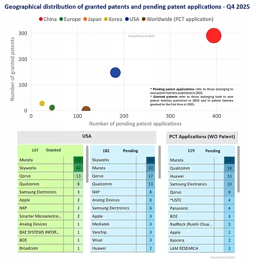 Figure 2: Global distribution of granted patents and pending patent applications for RF front-end modules & components in Q4 2025, and ranking of patent assignees by the number of pending application and granted patents in the United States and via PCT route.