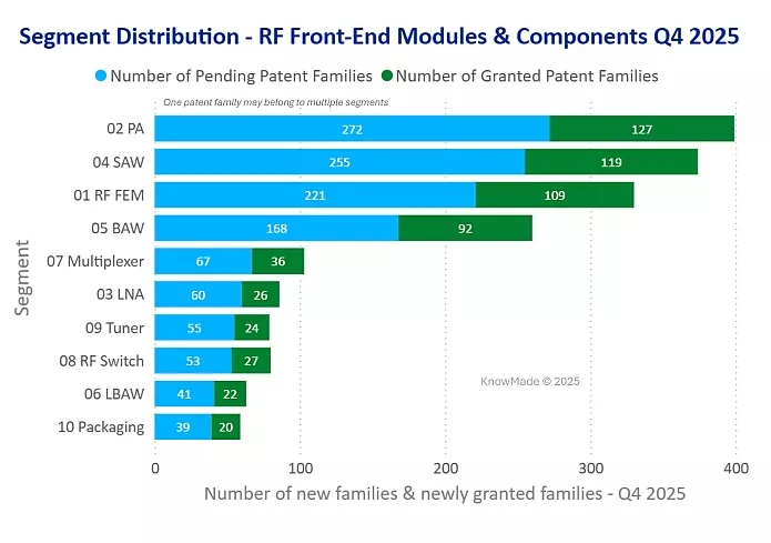 Figure 3: Segment distribution of new patent family publications and patent families granted for the first time for RF front-end modules & components in Q4 2025.