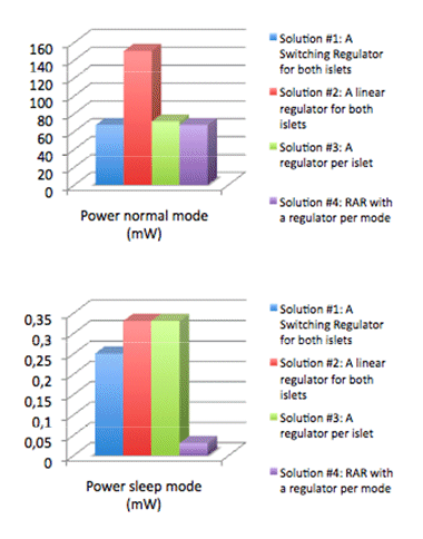 The comparison is performed for two loads: one with some logic always-on and the other with the whole logic and RF with two modes. Their typical power consumption is 50 mA for normal mode and 10 µA for sleep mode.
