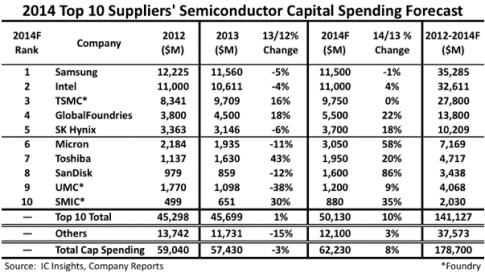 SK Hynix is expected to display an 18% increase in spending in 2014. However, given the company’s excellent sales performance in 2013 (43% growth) and its aggressive rebuilding program for its fire-damaged China DRAM fab, IC Insights believes there is potential upside to this estimate.