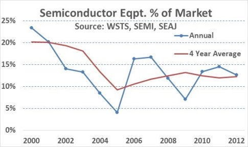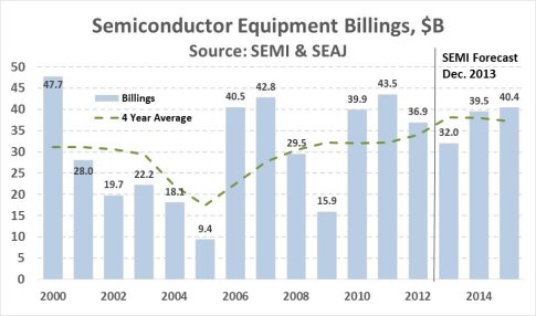 A four year average of semiconductor equipment billings shows a more consistent trend. Over-investment in 2000 kept the average close to $30 billion through 2003. Under-investment dragged the average down below $20 billion in 2005. The average recovered to $30 billion in 2008 after strong investment in 2006 and 2007. The average will reach about $38 billion in 2013 and should remain close to that number based on SEMI’s forecast through 2015.