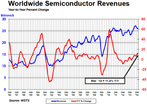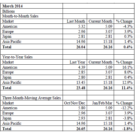 “The global semiconductor market has demonstrated consistent momentum in recent months, and sales are well ahead of last year’s pace through the first quarter of 2014,” said Brian Toohey, president and CEO, Semiconductor Industry Association. “Perhaps most impressively, sales in March increased across all regions and every semiconductor product category compared to last year, demonstrating the market’s broad and diverse strength.”