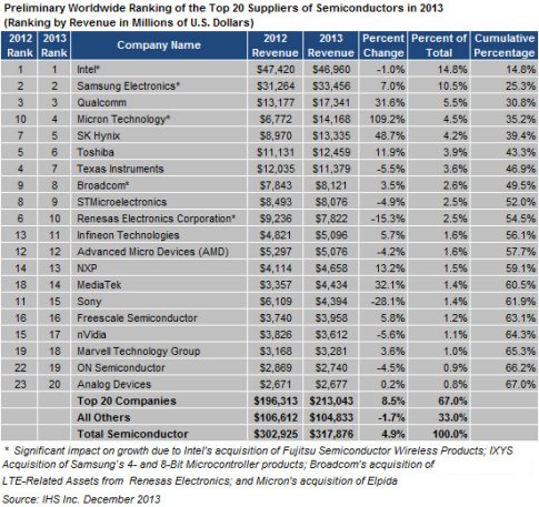 The table attached presents the preliminary IHS market share estimate of global semiconductor market share in 2013.