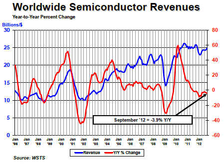 WASHINGTON, D.C.—Nov. 7, 2012—The Semiconductor Industry Association (SIA), representing U.S. leadership in semiconductor manufacturing and design, today announced that worldwide sales of semiconductors reached $24.79 billion for the month of September 2012, a 2 percent increase from the prior month when sales were $24.30 billion. Sales from the third quarter of 2012 totaled $74.4 billion – a 1.8 percent jump compared to the previous quarter – but total 2012 sales were down 4.7 percent compared to the same time last year. All monthly sales numbers represent a three-month moving average.