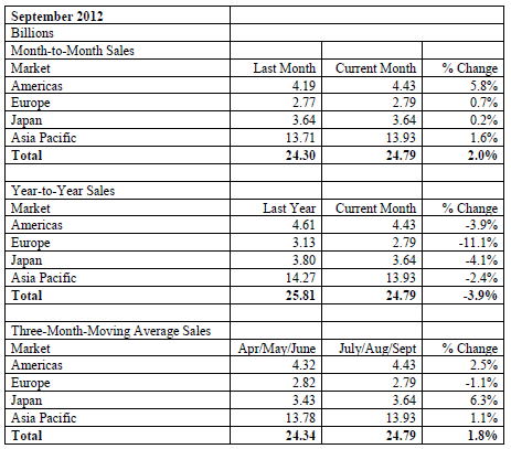 Regionally, sales increased by 5.8 percent in the Americas on a sequential monthly basis, marking the region’s largest increase since May 2010. Sales also increased from August to September in Asia Pacific (1.6 percent), Europe (0.7 percent) and Japan (0.2 percent), but all four regions lagged behind September 2011 sales.