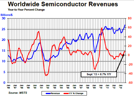 WASHINGTON, D.C.—Nov. 4, 2013—The Semiconductor Industry Association (SIA), representing U.S. leadership in semiconductor manufacturing and design, today announced that worldwide sales of semiconductors reached $80.92 billion during the third quarter of 2013, the industry’s highest-ever quarterly total and an increase of 8.4 percent over the second quarter total of $74.64 billion. Global sales for the month of September 2013 reached $26.97 billion, the highest monthly total ever and an increase of 8.7 percent compared to September 2012. Sales in the Americas increased by 24.3 percent compared to September 2012, while global sales this September were 3.3 percent higher than the previous month’s total of $26.10 billion. All monthly sales numbers are compiled by the World Semiconductor Trade Statistics (WSTS) organization and represent a three-month moving average.