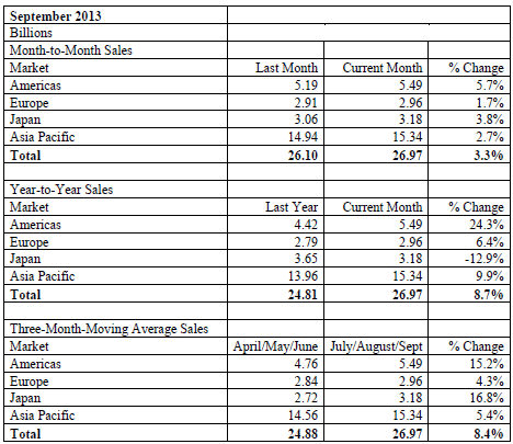 September sales topped sales from the same month last year in the Americas (24.3 percent), Asia Pacific (9.9 percent), and Europe (6.4 percent), but decreased in Japan (-12.9 percent), in large part because of the devaluation of the Japanese yen. Sales in September were up across all regions compared to the previous month, with the Americas posting the largest increase (5.7 percent).