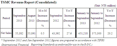 Hsinchu, Taiwan, R.O.C. – Oct. 9, 2013 - TSMC (TWSE: 2330, NYSE: TSM) today announced its net revenues for September 2013: On a consolidated basis, revenues for September 2013 were approximately NT$55.38 billion, an increase of 0.5 percent from August 2013 and an increase of 27.6 percent over September 2012. Revenues for January through September 2013 totaled NT$451.22 billion, an increase of 20.2 percent compared to the same period in 2012.