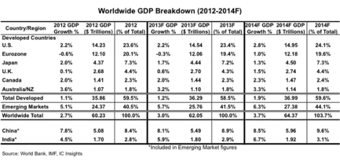 China’s GDP growth rate was announced to be 7.7% in 1Q13. With China’s economy expected to pick up momentum in the second half of this year, IC Insights has left its 8.1% full-year forecast for China’s GDP growth unchanged.