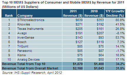 French-Italian based STMicroelectronics in 2011 maintained its status as the top supplier with a 30 percent share of the overall consumer and mobile MEMS market, up from 22 percent in 2010.