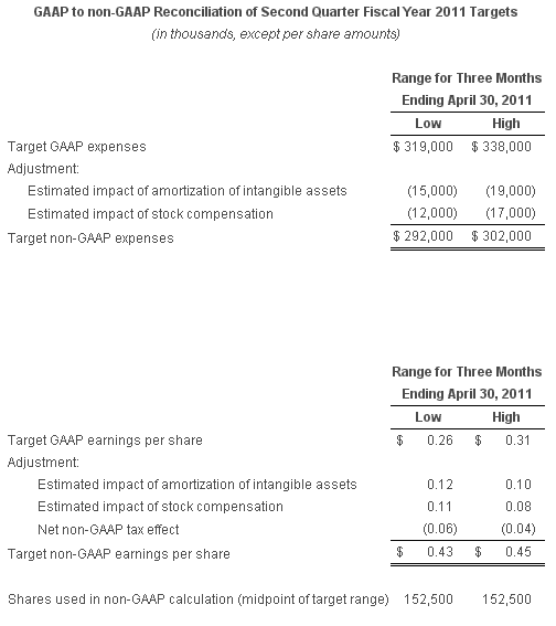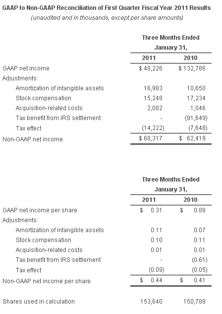 On a non-GAAP basis, net income for the first quarter of fiscal 2011 was $68.3 million, or $0.44 per share, compared to non-GAAP net income of $62.4 million, or $0.41 per share, for the first quarter of fiscal 2010. Reconciliation between GAAP and non-GAAP results is provided at the end of this press release.
