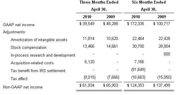 On a non-GAAP basis, net income for the second quarter of fiscal 2010 was $61.9 million, or $0.41 per share, compared to non-GAAP net income of $65.9 million, or $0.45 per share, for the second quarter of fiscal 2009.