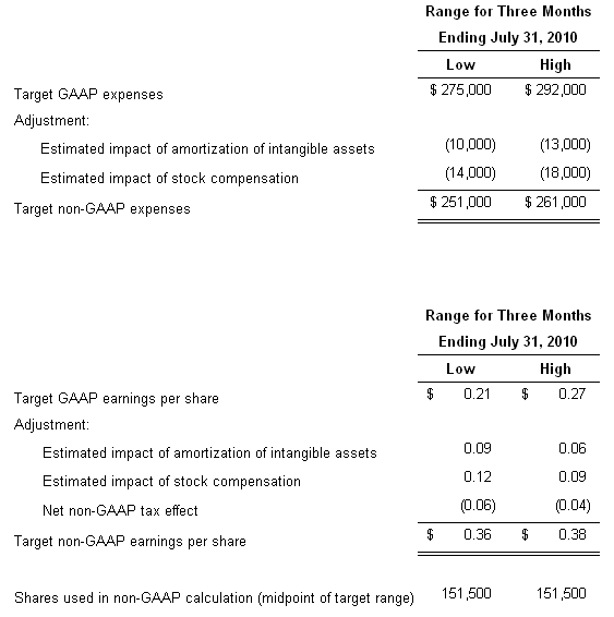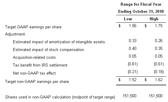 GAAP to non-GAAP Reconciliation of Third Quarter Fiscal Year 2010 Targets