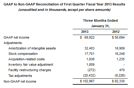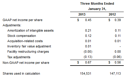 On a non-GAAP basis, net income for the first quarter of fiscal 2013 was $103.0 million, or $0.67 per share, compared to non-GAAP net income of $82.3 million, or $0.56 per share, for the first quarter of fiscal 2012. Reconciliation between GAAP and non-GAAP results is provided at the end of this press release. Due to our fiscal calendar, the first quarter of fiscal year 2012 included an extra week.