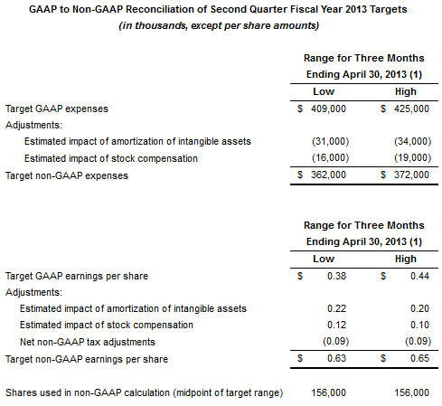 Synopsys also provided its financial targets for the second quarter and full fiscal year 2013. These targets do not include any impact of future acquisition-related activities. These targets constitute forward-looking information and are based on current expectations. For a discussion of factors that could cause actual results to differ materially from these targets, see "Forward-Looking Statements" below.