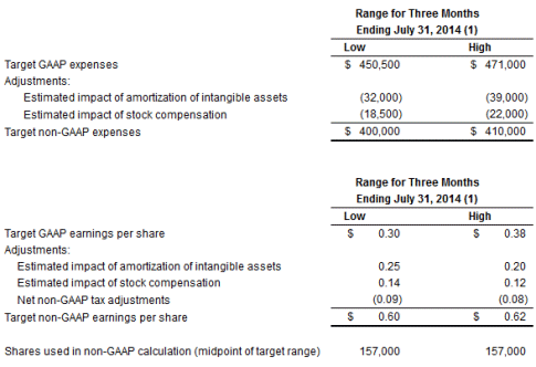 Synopsys also provided its financial targets for the third quarter and full fiscal year 2014. These targets do not include any future acquisition-related expenses that may be incurred in fiscal 2014. These targets constitute forward-looking information and are based on current expectations. For a discussion of factors that could cause actual results to differ materially from these targets, see "Forward-Looking Statements" below.