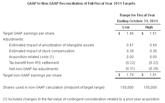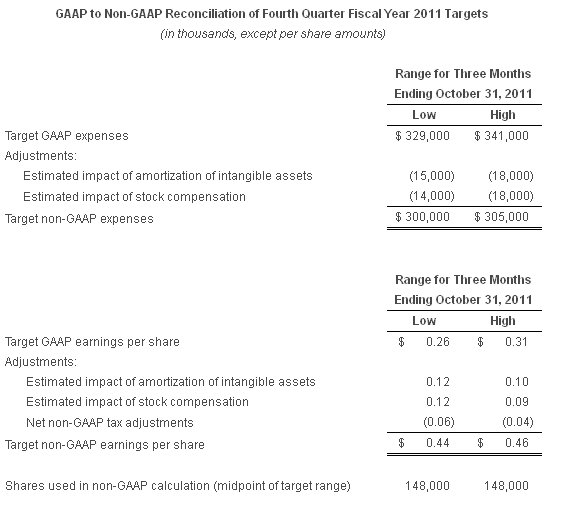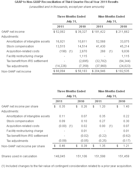 On a non-GAAP basis, net income for the third quarter of fiscal 2011 was $68.1 million, or $0.46 per share, compared to non-GAAP net income of $58.2 million, or $0.39 per share, for the third quarter of fiscal 2010. Reconciliation between GAAP and non-GAAP results is provided at the end of this press release.