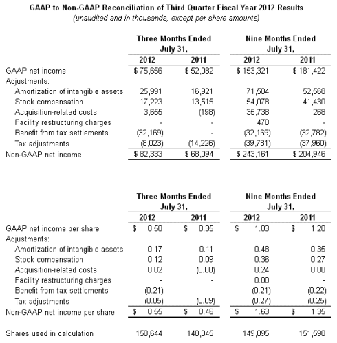 On a non-GAAP basis, net income for the third quarter of fiscal year 2012 was $82.3 million, or $0.55 per share, compared to non-GAAP net income of $68.1 million, or $0.46 per share, for the third quarter of fiscal year 2011.