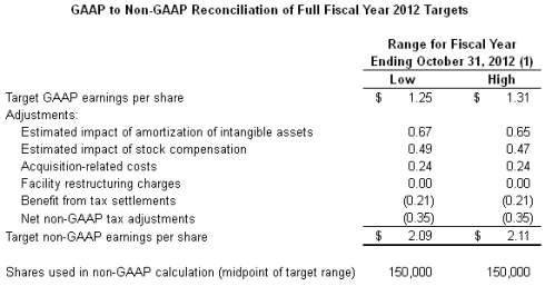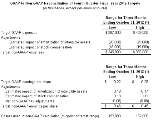 Synopsys also provided its financial targets for the fourth quarter and full fiscal year 2012. These targets do not include any impact from the pending acquisition of SpringSoft, or other future acquisition-related expenses that may be incurred in fiscal year 2012. These targets constitute forward-looking information and are based on current expectations. For a discussion of factors that could cause actual results to differ materially from these targets, see "Forward-Looking Statements" below.